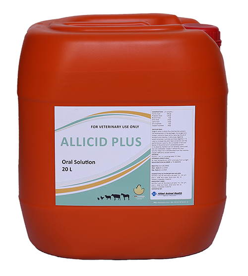 Organic acid in Allicid Plus Oral Solution prevent the development of the pathogen microogranisms living neutral or basic pH by reducing the pH of stomach and intestine. It stimulates digestive system enzymes in animals and help digestion. It is used to increase the yield, feed conversion and the performance in poultry. Zinc is located in hair and bones of animal and it accelerates growth. Copper in Allicid Plus Oral Solution helps iron to be absorbed from the intestine. Copper deficiency causes anemia.